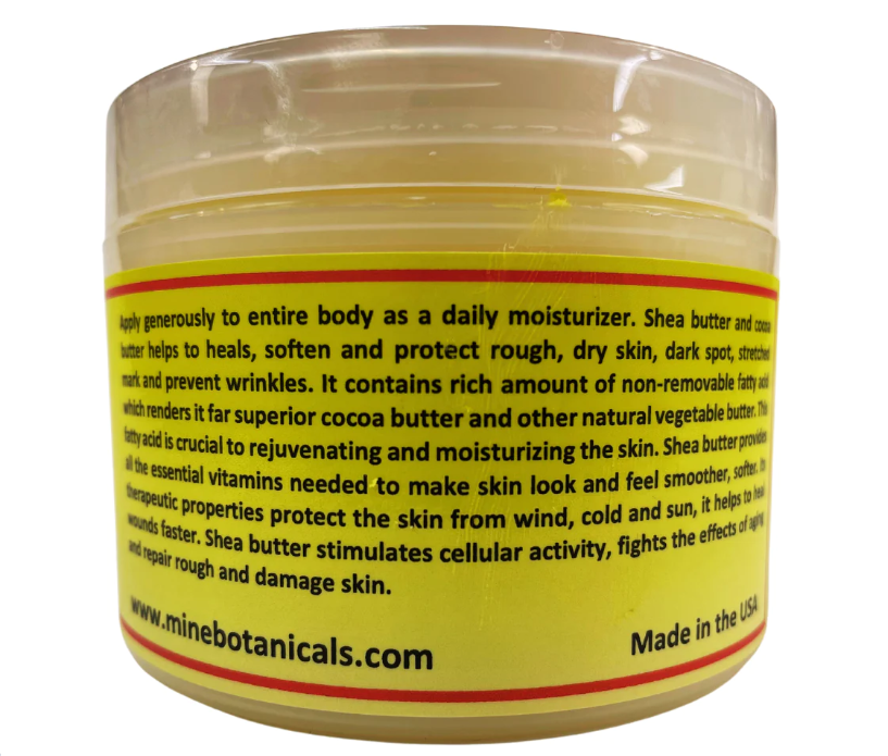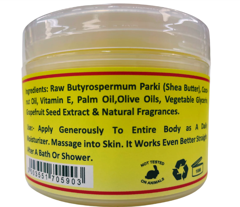 Ingredients:- Raw Butyrospermum Parkii (Shea Butter), Persea Americana (Avocado Extract), Nigella Sativa (Black Seed Oil Extracted from Black Seed), Vitamin-E Oil, Palm Oil, Olive Oil, Coconut Oil, Vegetable Glycerin, Grapefruit Seed Extract and Natural Fragrance (Essential oil blend).