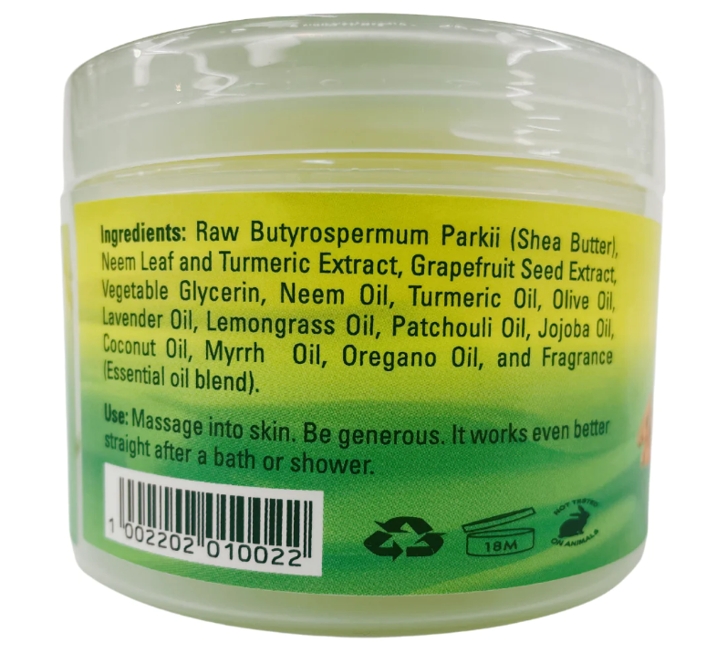 Ingredients: Raw Butyrospermum Parkii (Shea Butter), Azadirachta Indica (Neem Leaf Extract), Curcuma Longa (Turmeric Extract), Neem Oil, Turmeric Oil, Olive Oil, Lavender Oil, Lemongrass Oil, Patchouli Oil, Jojoba Oil, Myrrh Oil, Oregano Oil, Coconut Oil, Vegetable Glycerin, Grapefruit Seed Extract and Natural Fragrance (Essential oil blend).